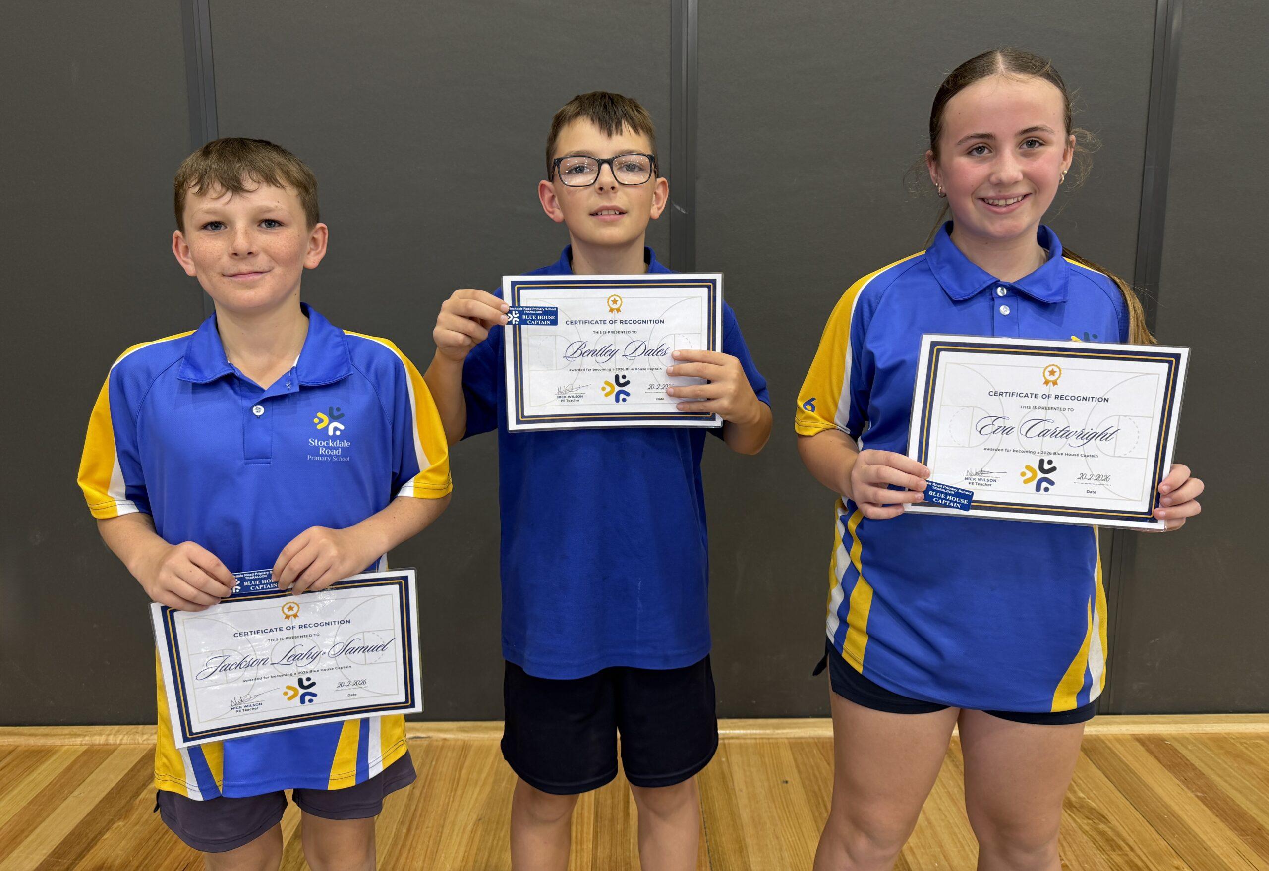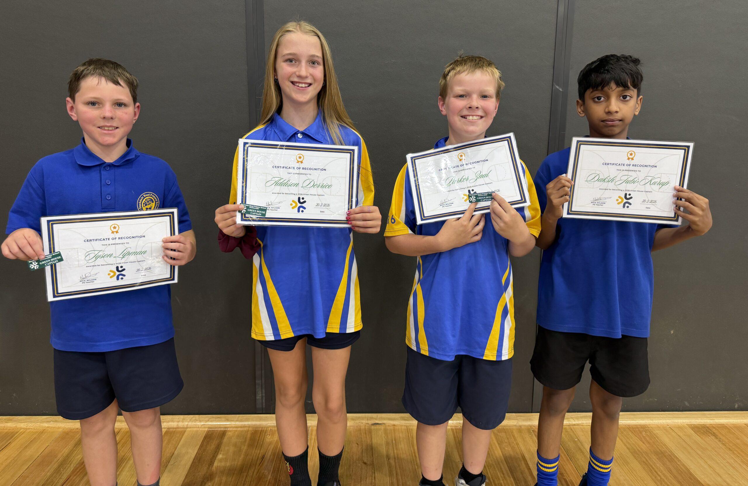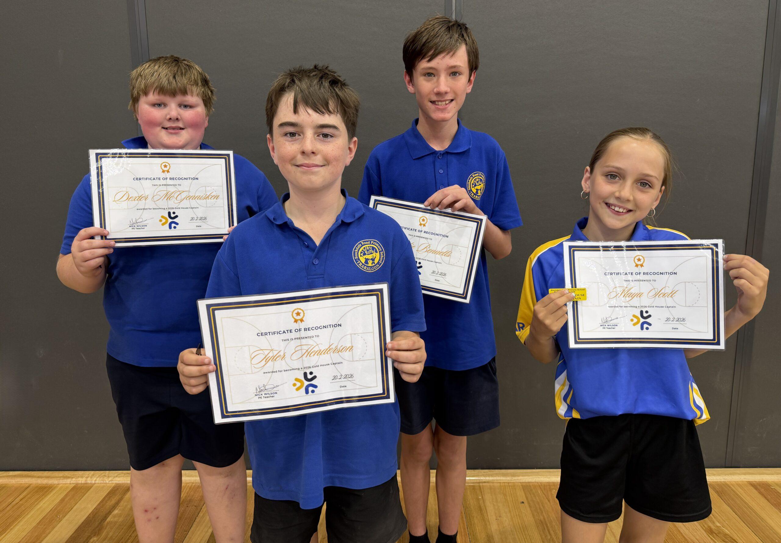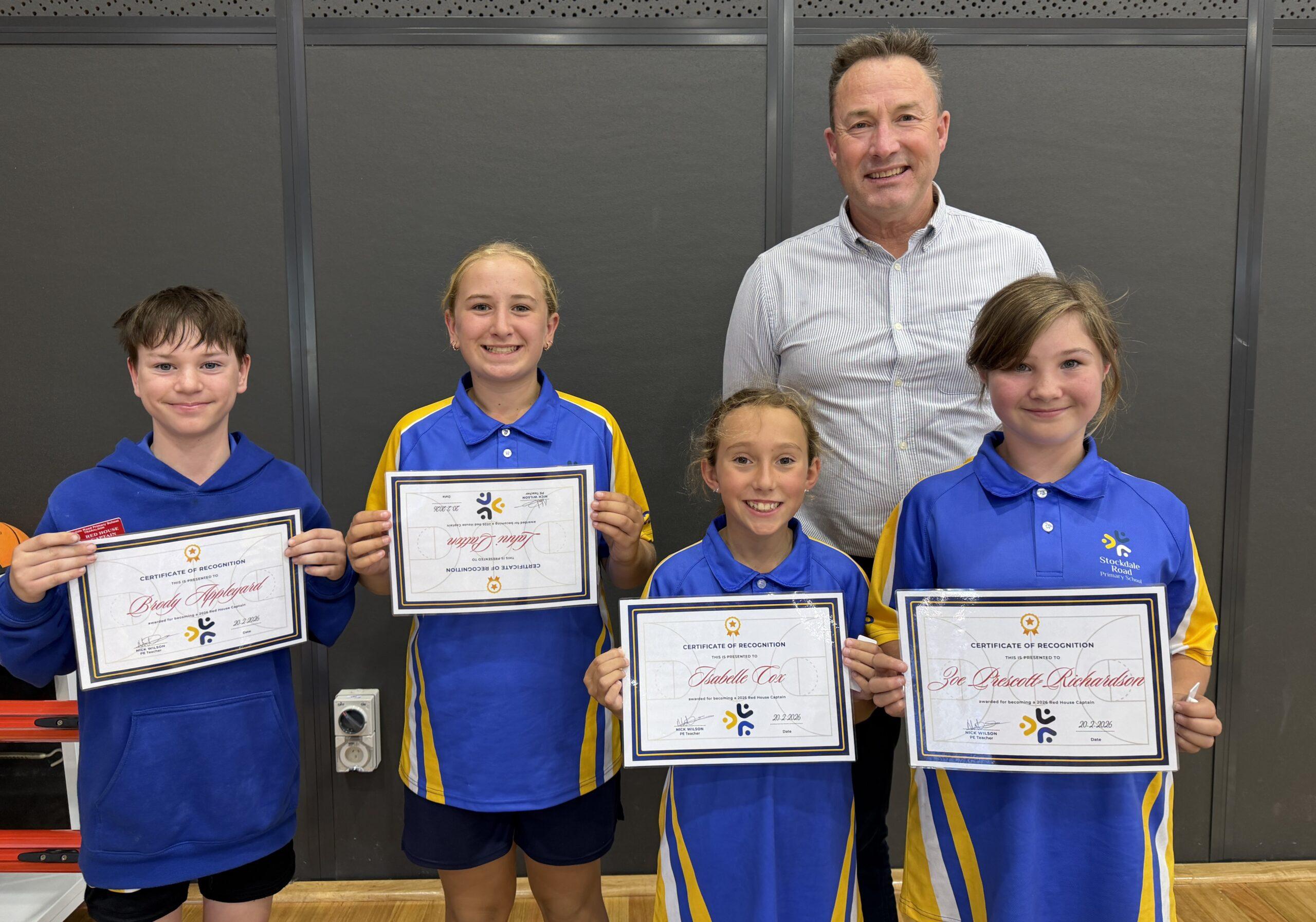 To be elected a Stockdale Road House Captain, students in year 6 put their name forward to represent their given house by preparing and delivering a speech to teachers and current House Captains explaining why they would be a great leader. After the presentations, a vote is held, and four students from each house are elected each year to represent their house as House Captains.